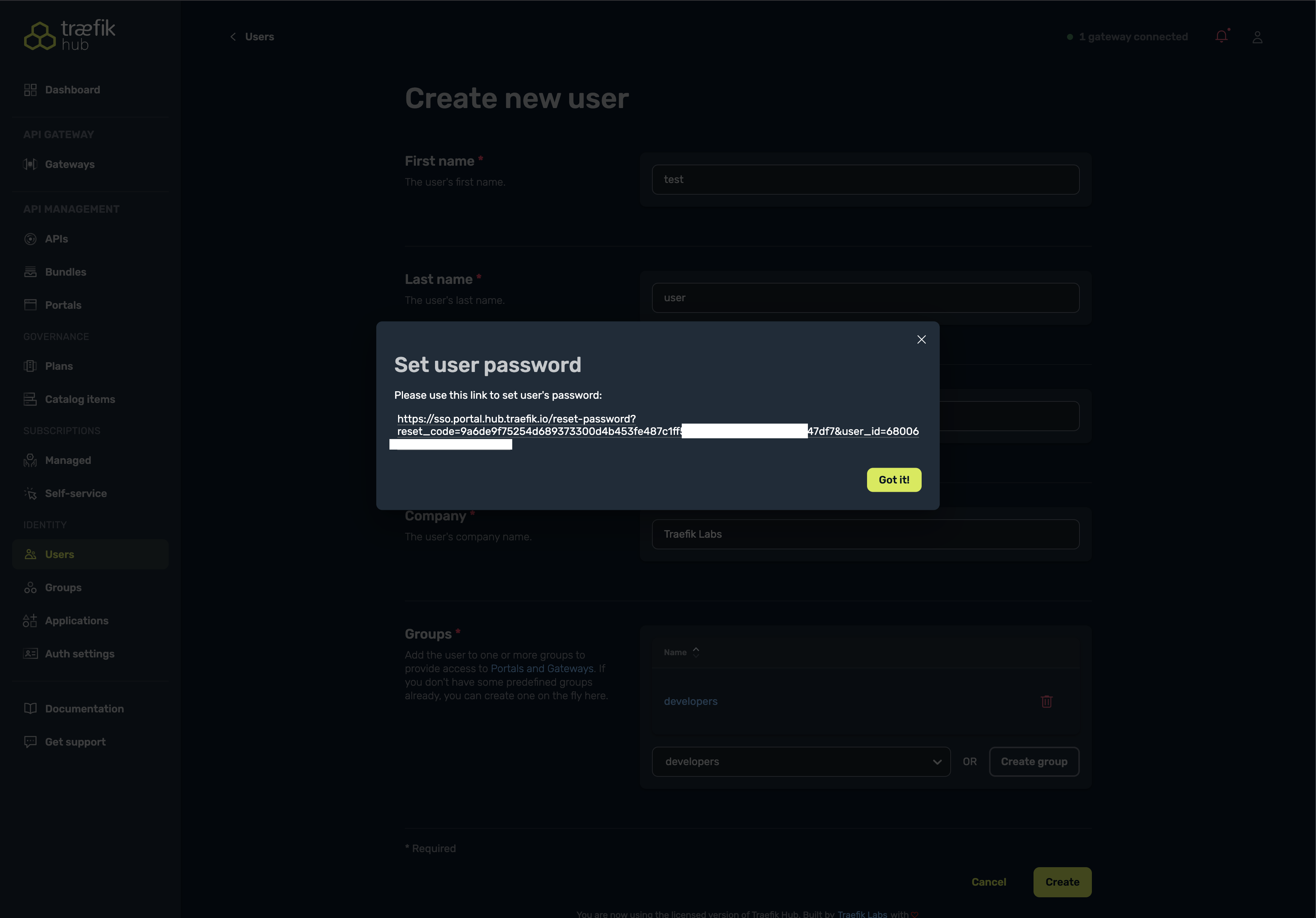 - After creating a new user, you'll be prompted to set a password. Select the link displayed and paste it in your browser to set a new password. Remember these credentials as they will be used to access the API Portal.