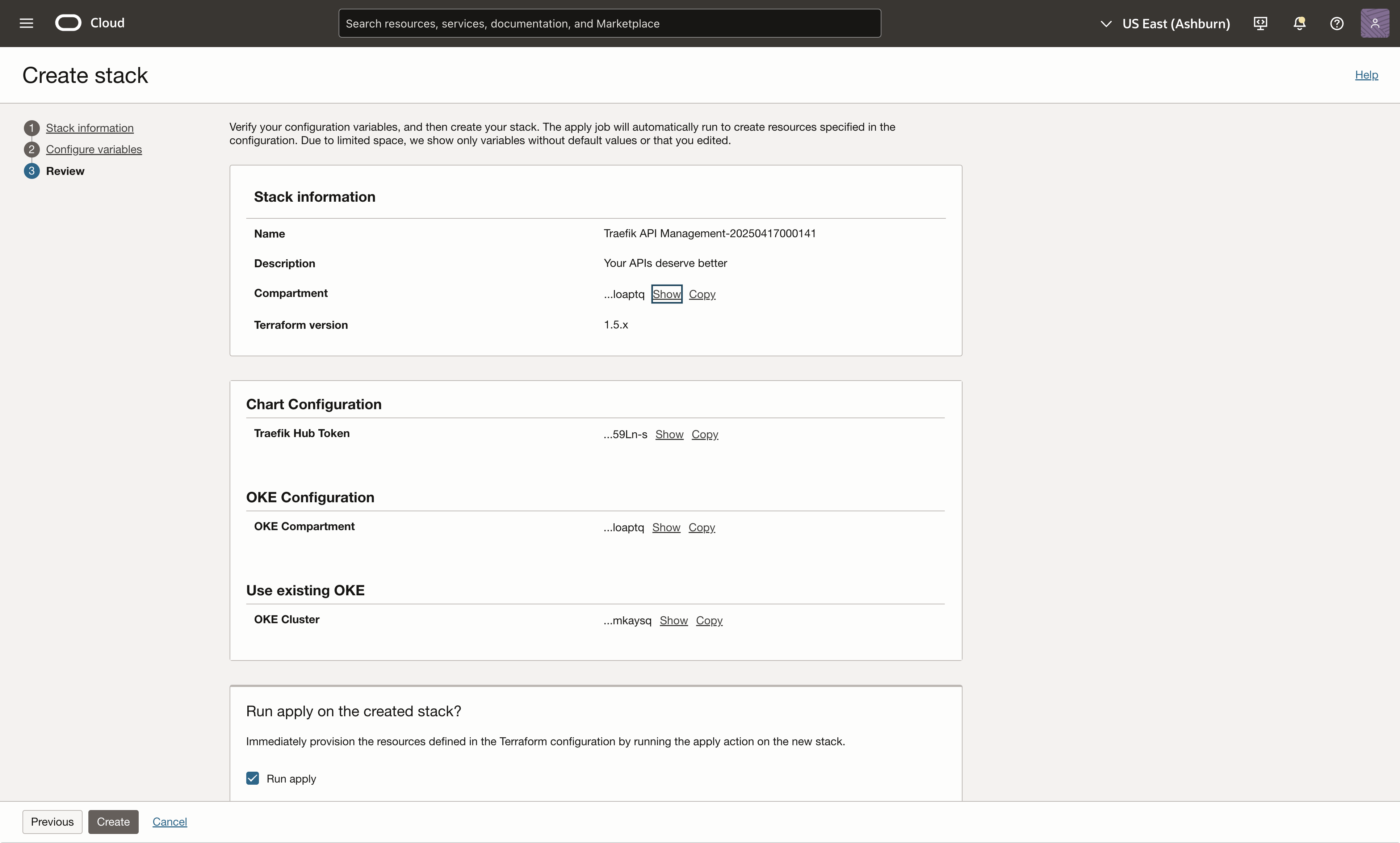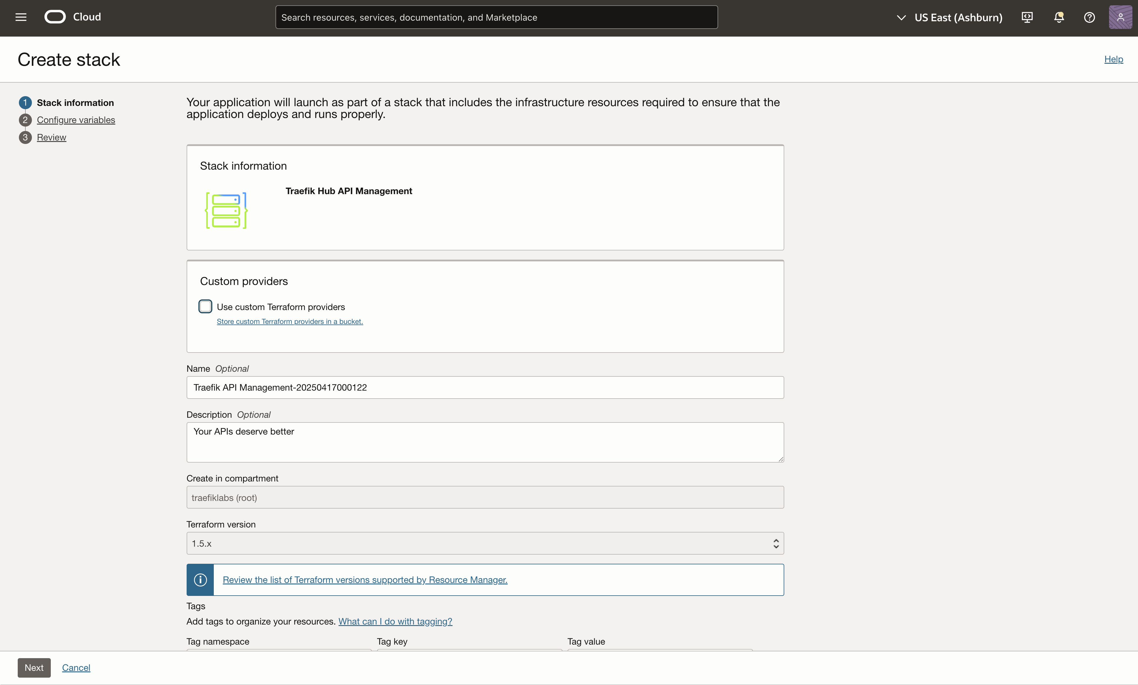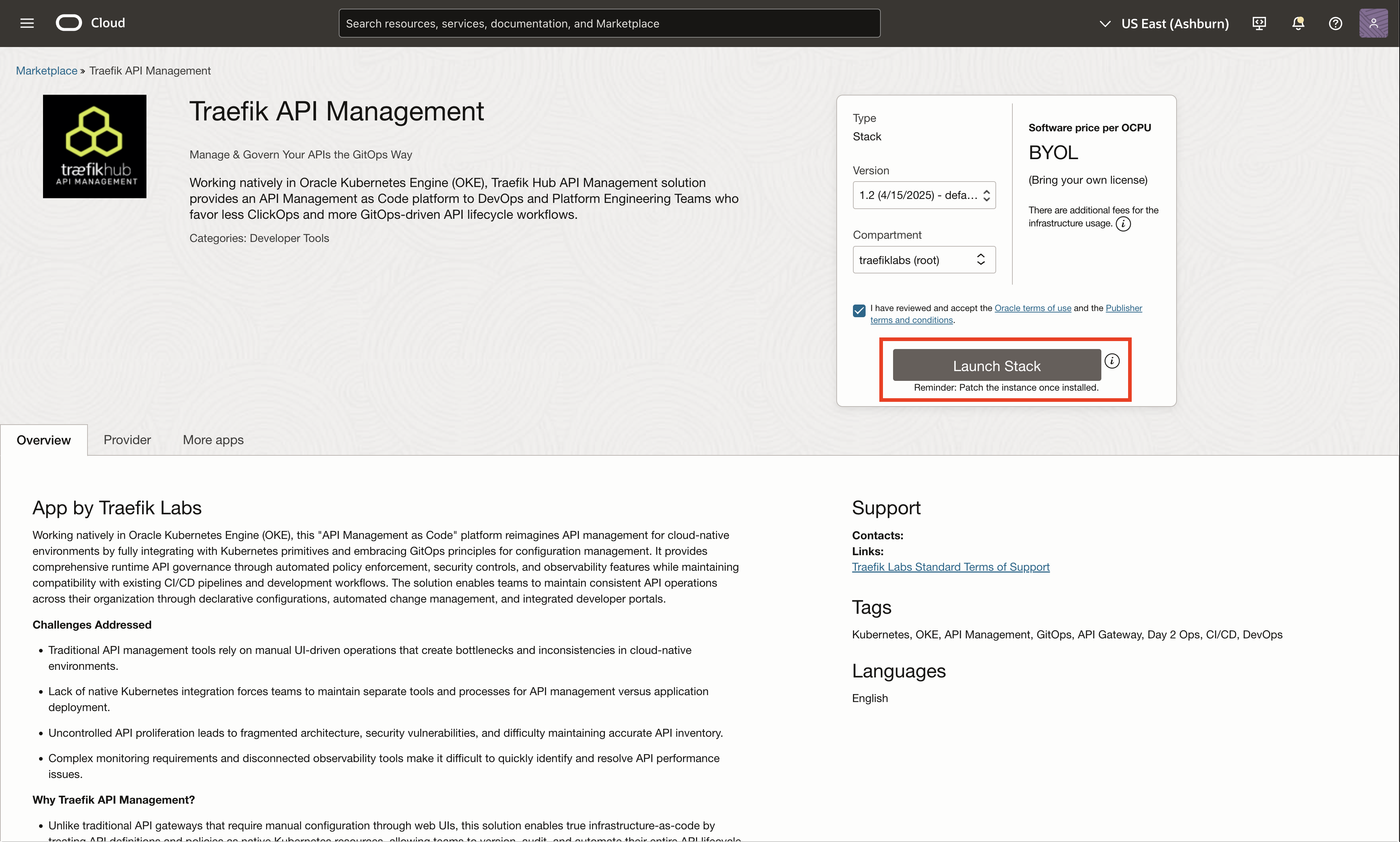 Navigate to the Traefik Hub API Management stack in the OCI marketplace and select Launch Stack.