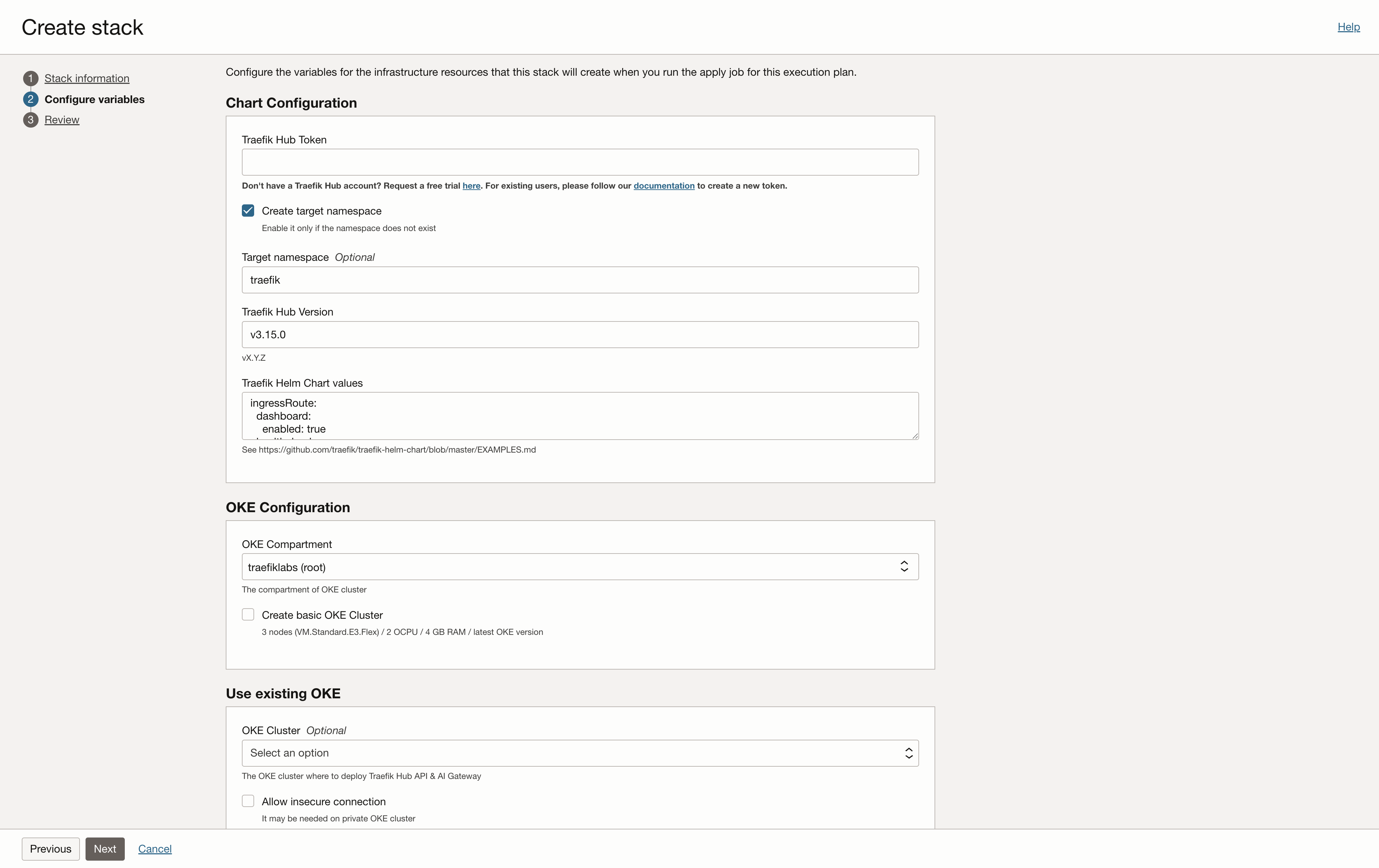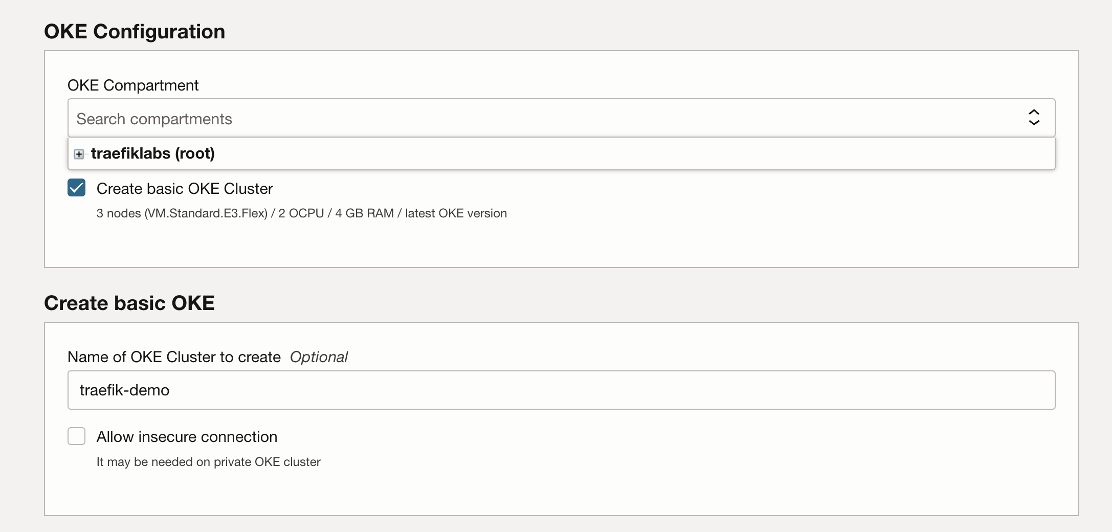 In the OKE configuration section, you can create a new basic OCI Kubernetes Engine cluster in a compartment of your choice if you don't already have one by selecting the Create Basic OKE cluster check box.