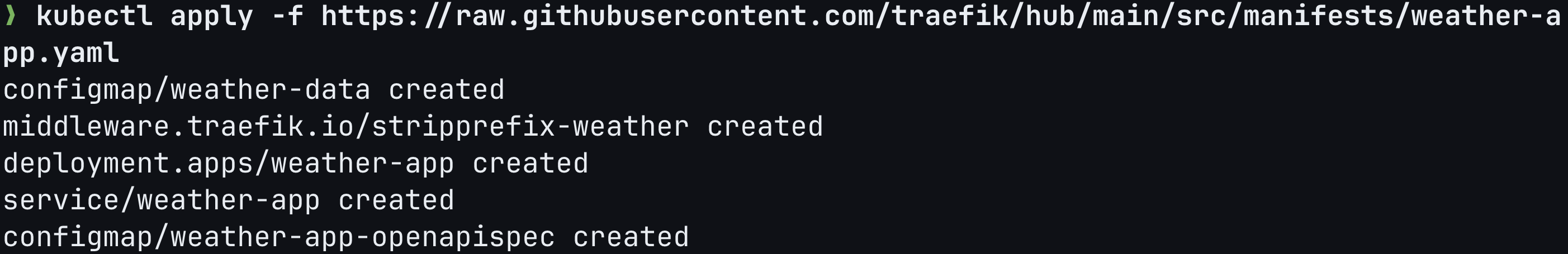 kubectl apply -f https://raw.githubusercontent.com/traefik/hub/main/src/manifests/weather-app.yaml