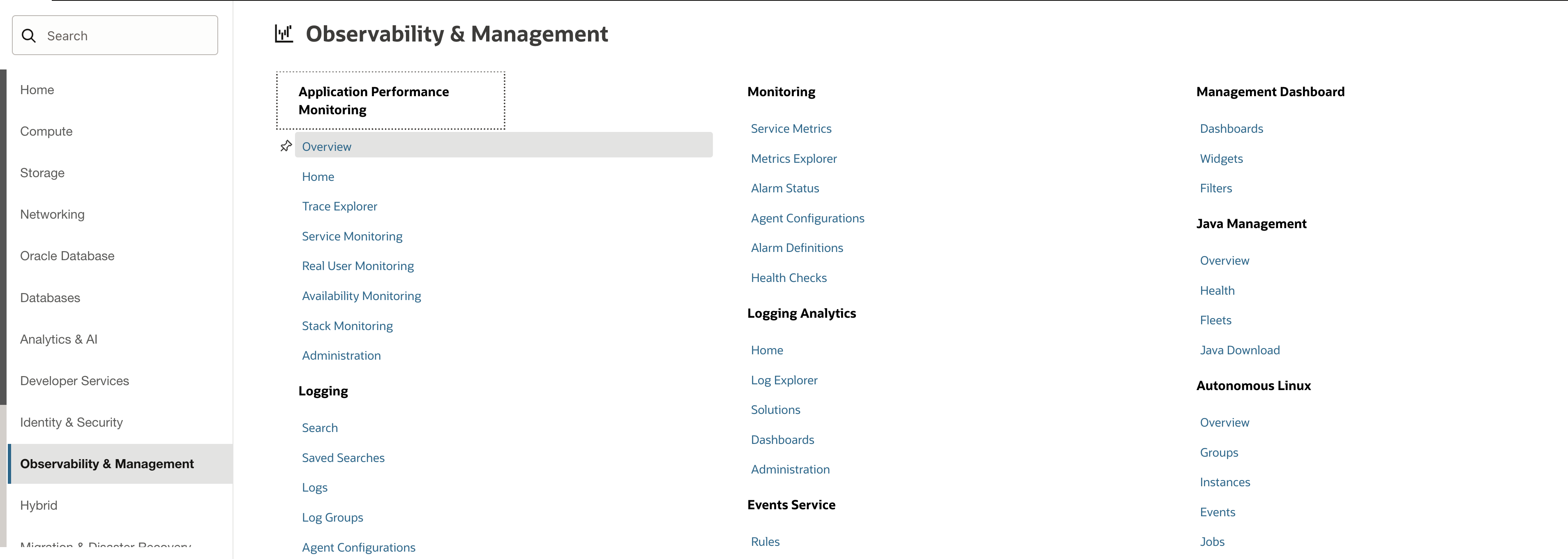 - Navigate to Observability & Management → Application Performance Monitoring → Overview. In the side menu, click Dashboards.