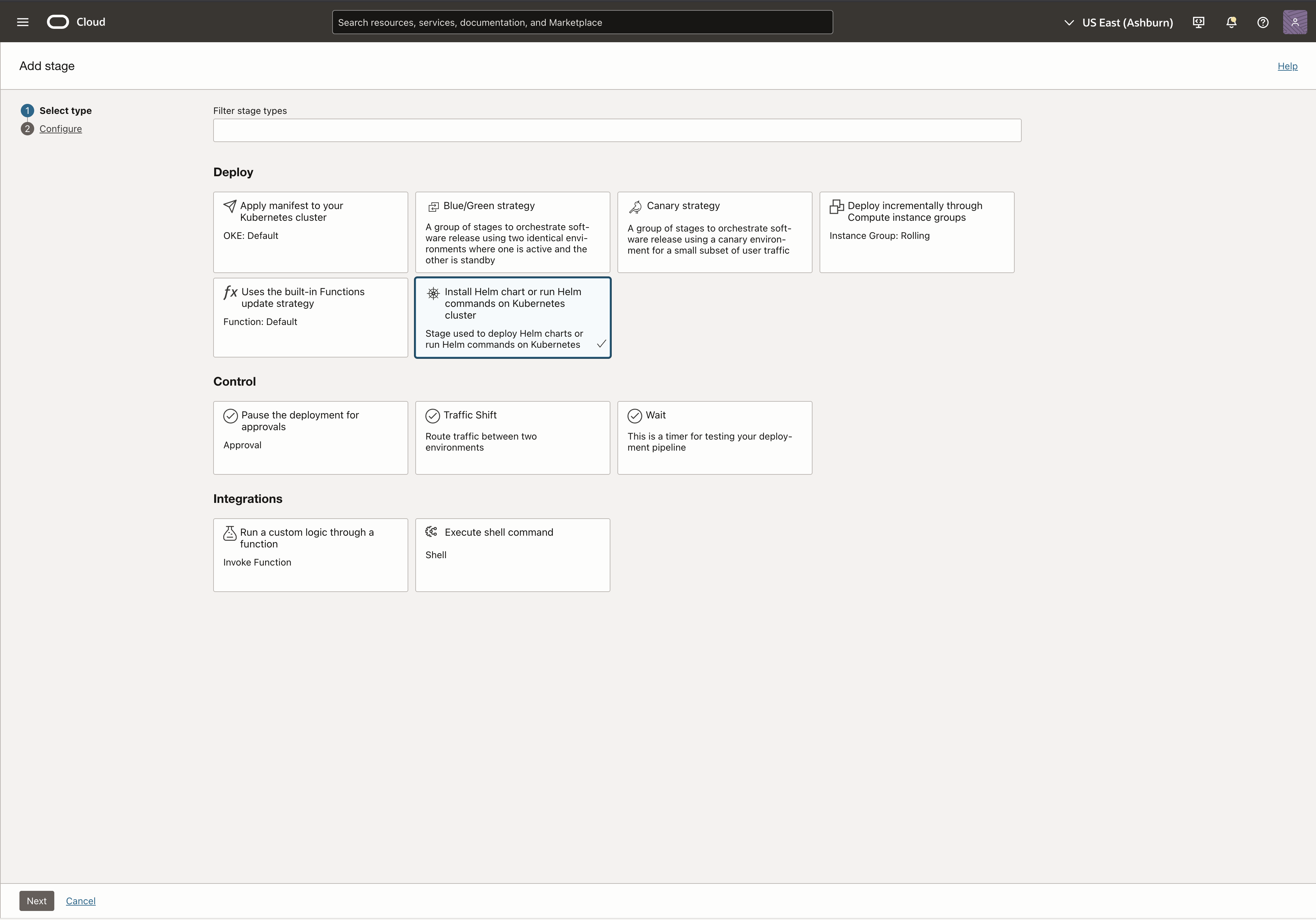 Create the second stage for deploying the Helm chart. Select Install Helm chart or run Helm command on Kubernetes cluster as the stage type: