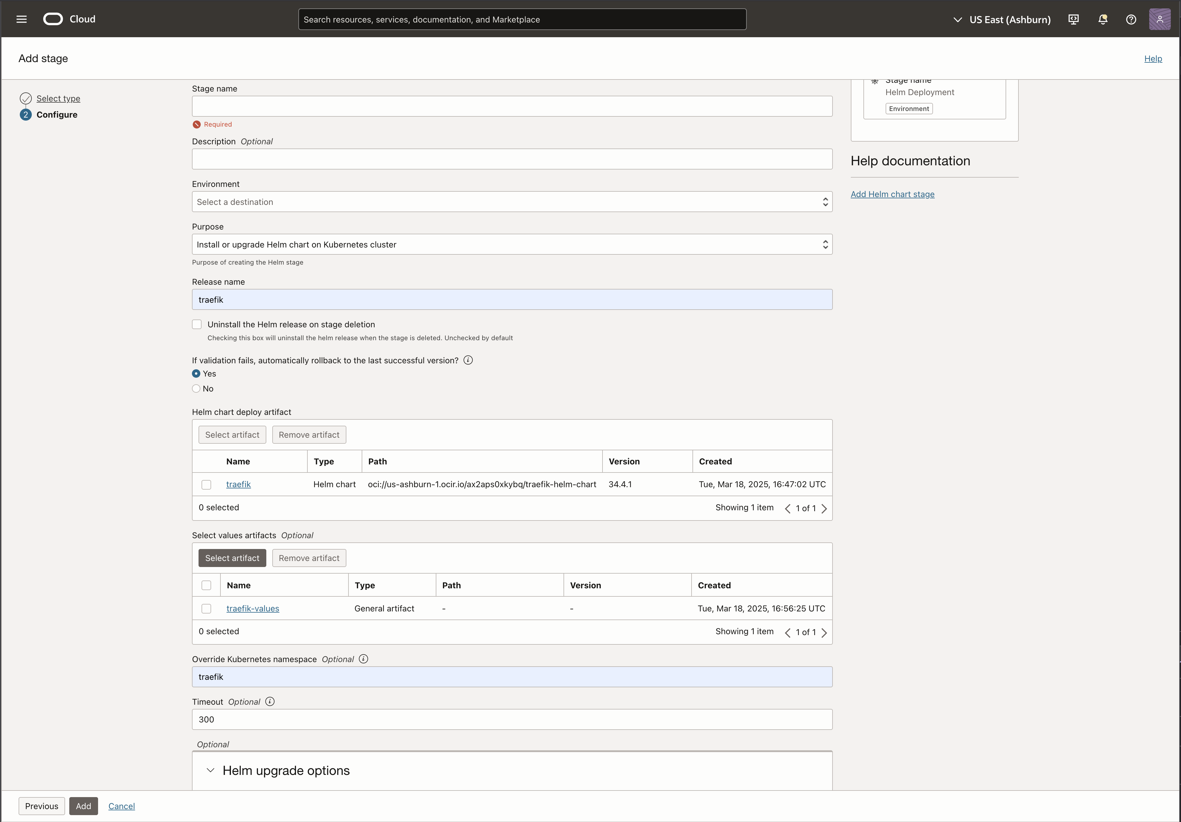 Fill in the required details. Select Install Helm Chart as the command. Attach the Traefik Helm Chart artifact and the Traefik Helm Chart Values artifact created earlier:
