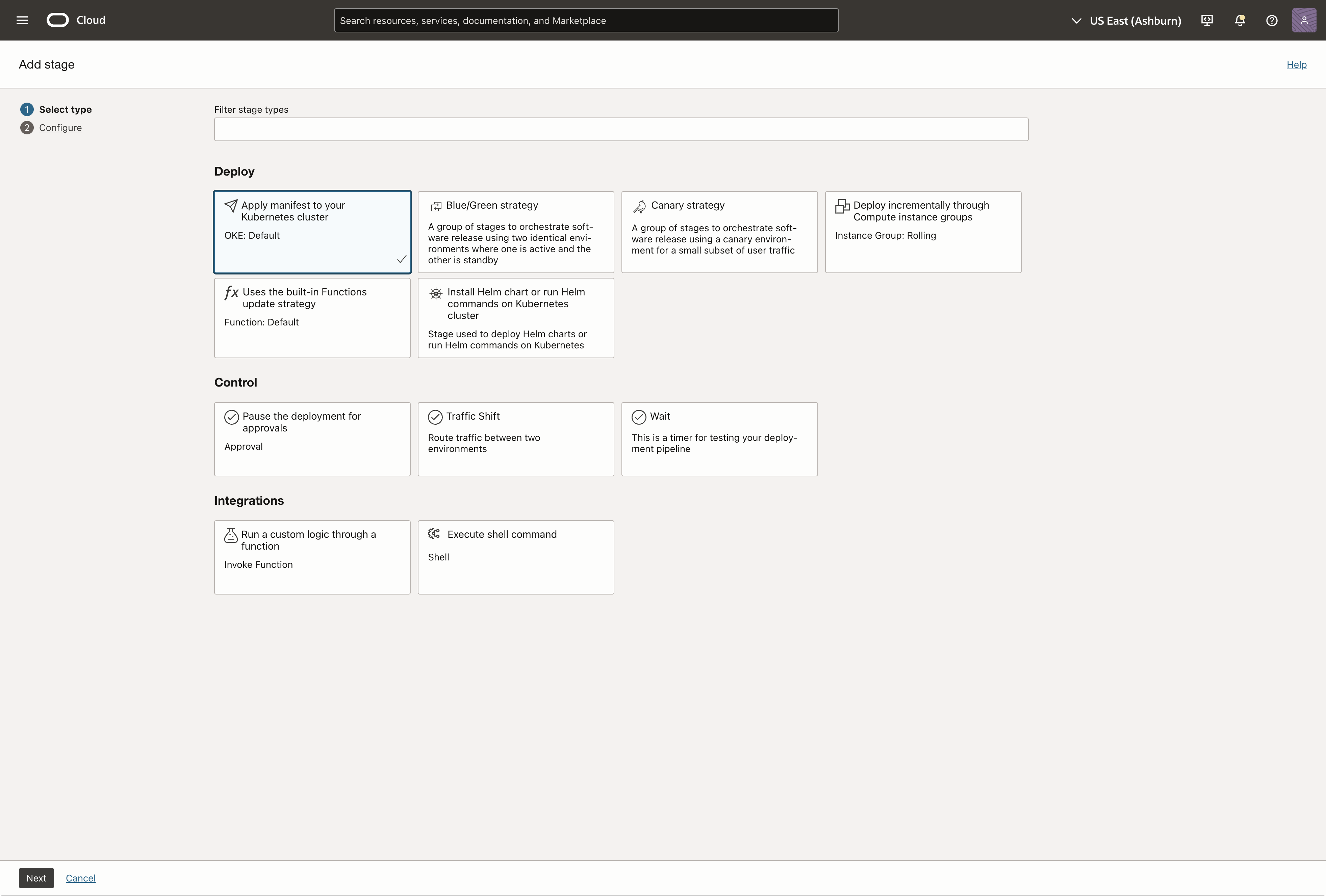 After completing these fields, select Next and choose your preferred region, compartment, and the target OCI Kubernetes Engine cluster.