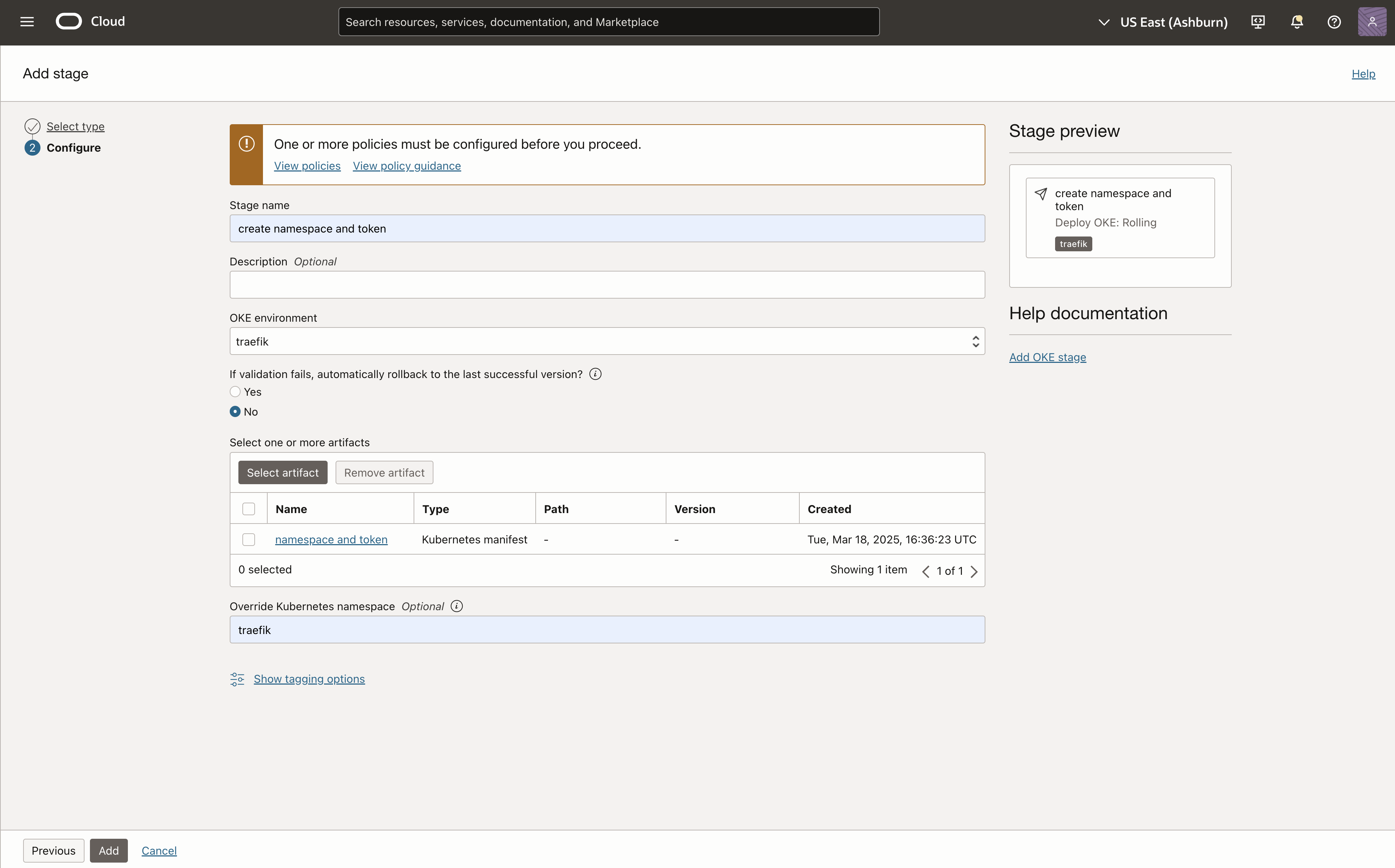 - Use a descriptive stage name (for example, "Create Namespace and Token").