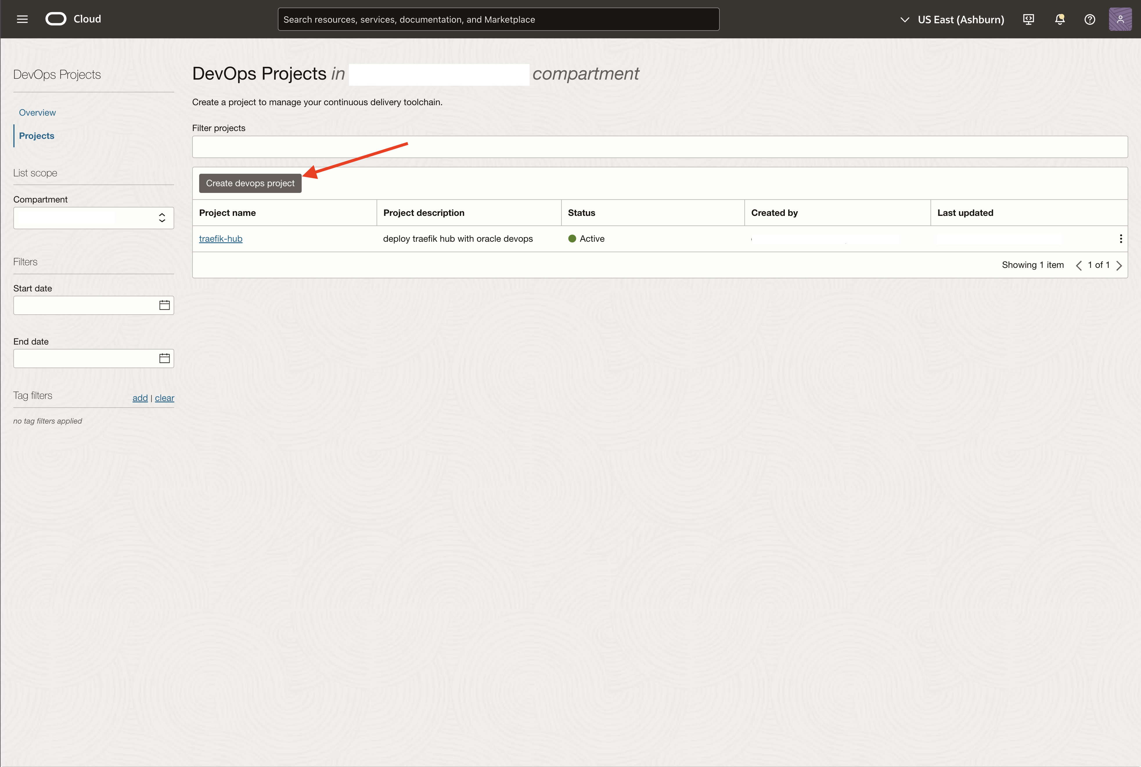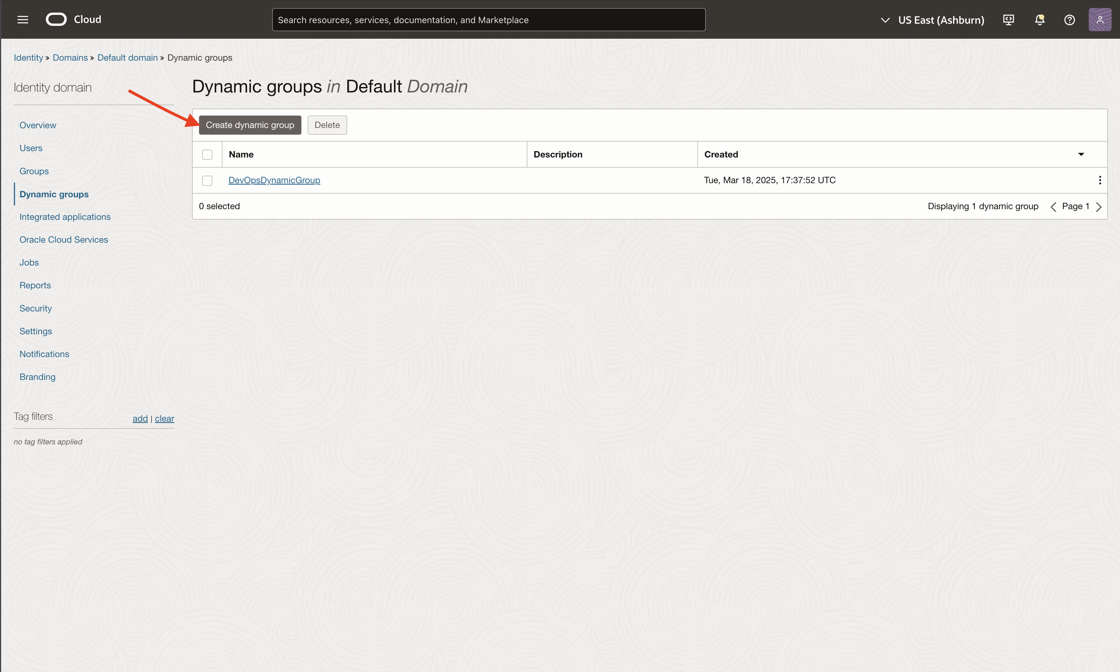 Before creating the DevOps project, you must create a new Dynamic Group and attach appropriate policies to it. This step is mandatory if not done previously, as policies allow OCI DevOps to make changes to your cluster.