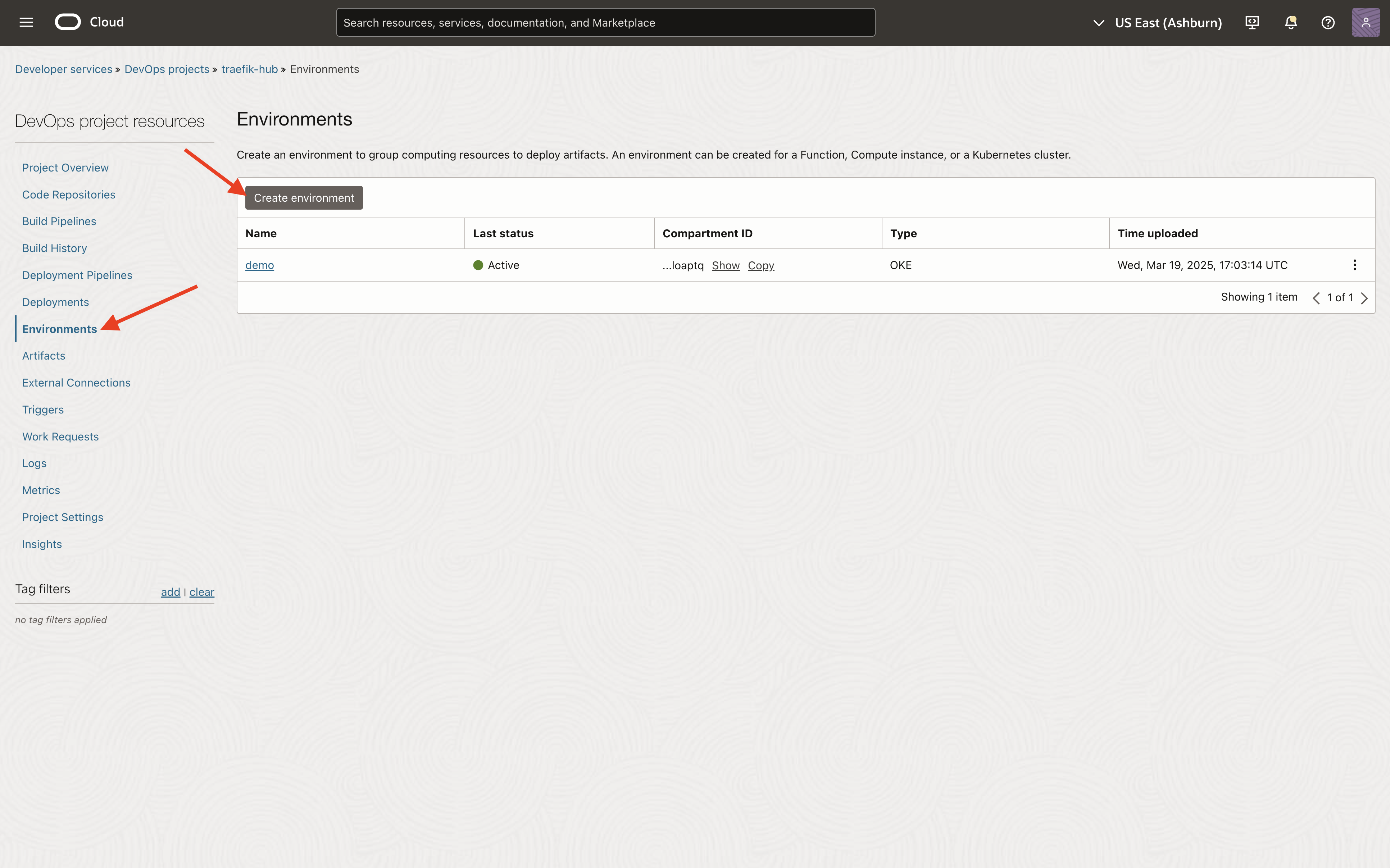 The Deployment Pipelines in OCI DevOps apply to a target Environment which is a group of computing resources. To create this environment, navigate to Environments in the side menu of your DevOps project and select Create Environment.