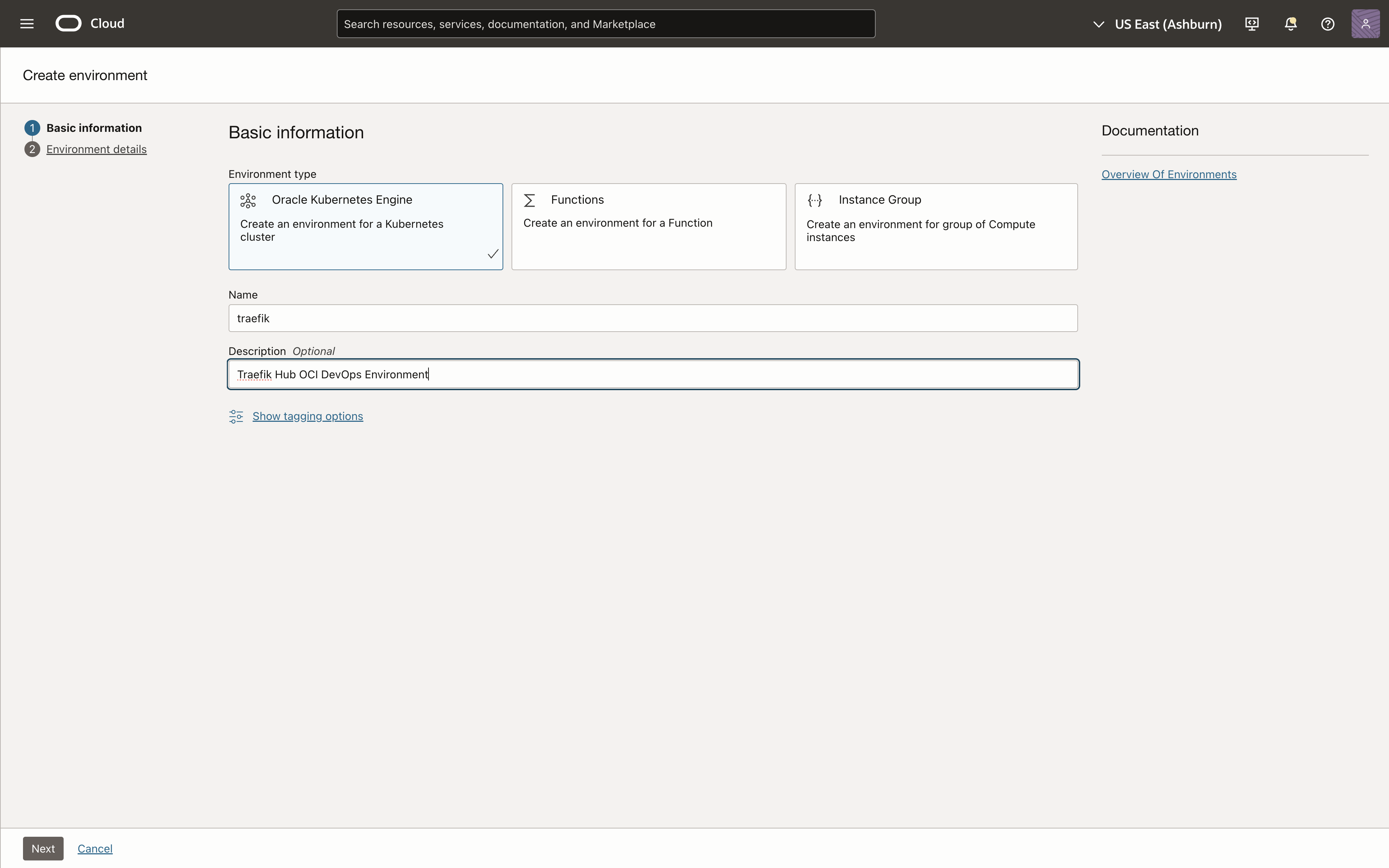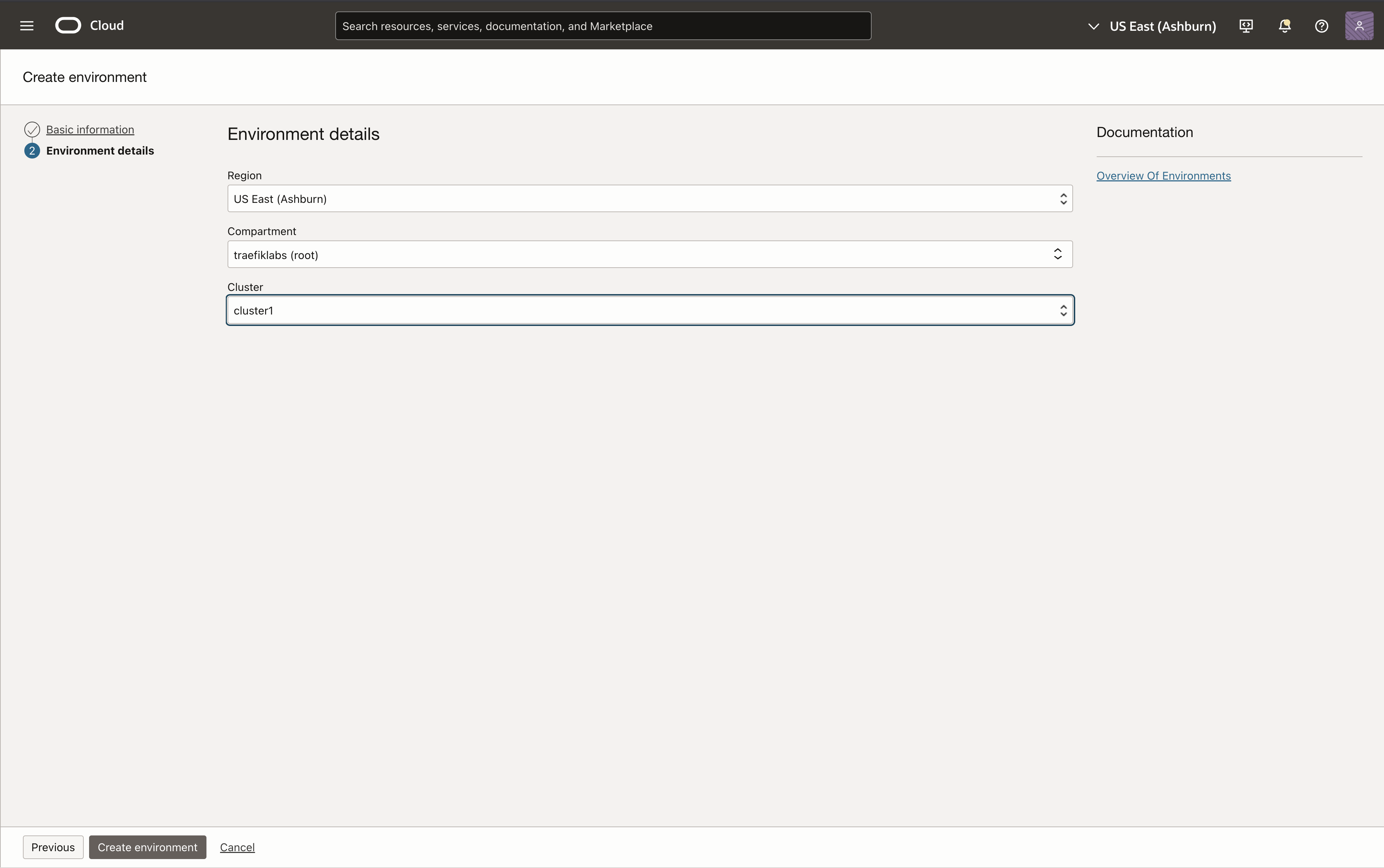 Next, select Oracle Kubernetes Engine cluster as the environment type, then provide a name and description for the environment.