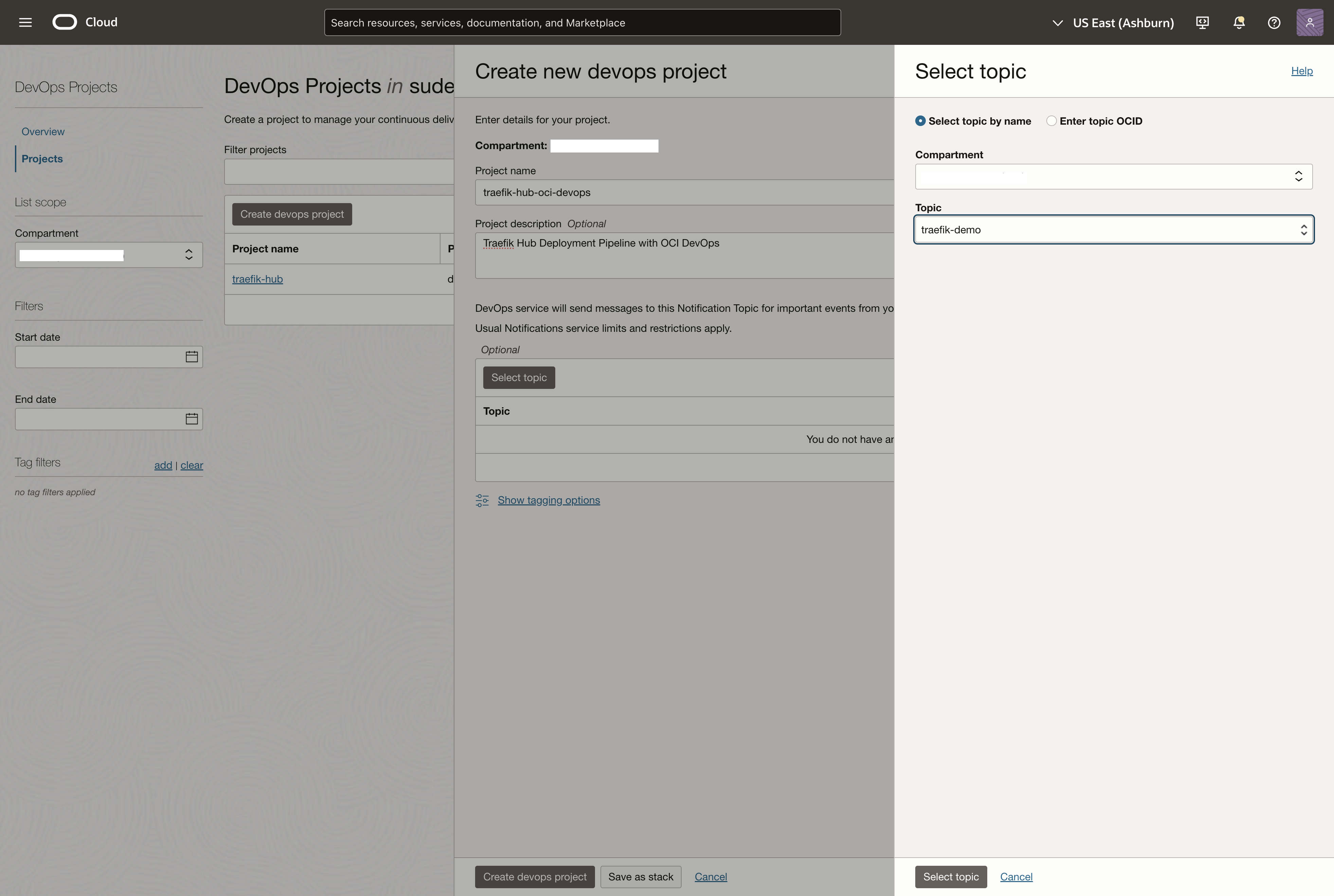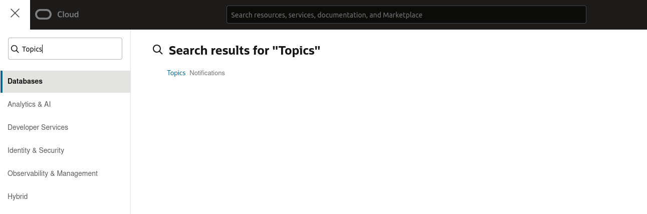 Before creating a new DevOps project, create a Topic to receive notifications about your OCI DevOps Project. In the OCI console menu, search for Topics, select Topics under Application Integration, and select Create Topic.