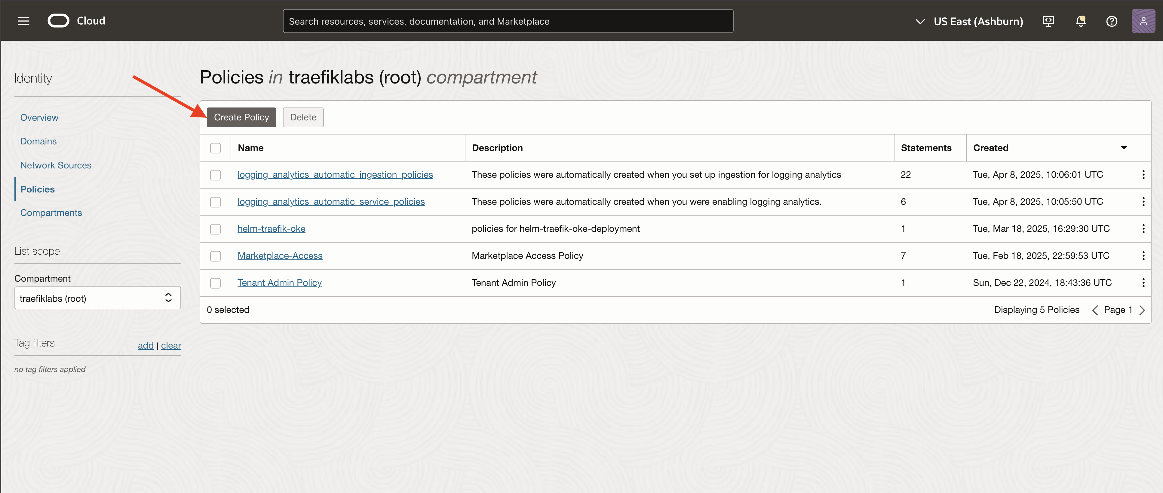 Next, you need to attach policies to the DevOpsDynamicGroup created previously. Navigate to Identity & Security > Policies in the OCI console to manage these policies.