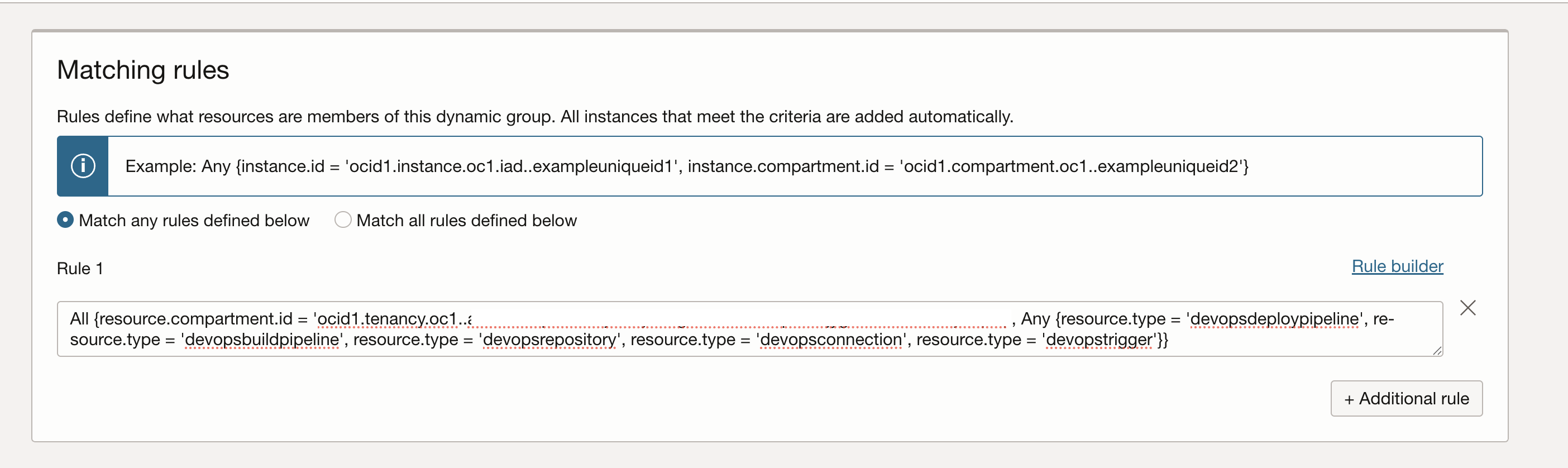 Give your dynamic group the name DevOpsDynamicGroup. For the matching rules, paste the following rule to cover all OCI DevOps resources:
