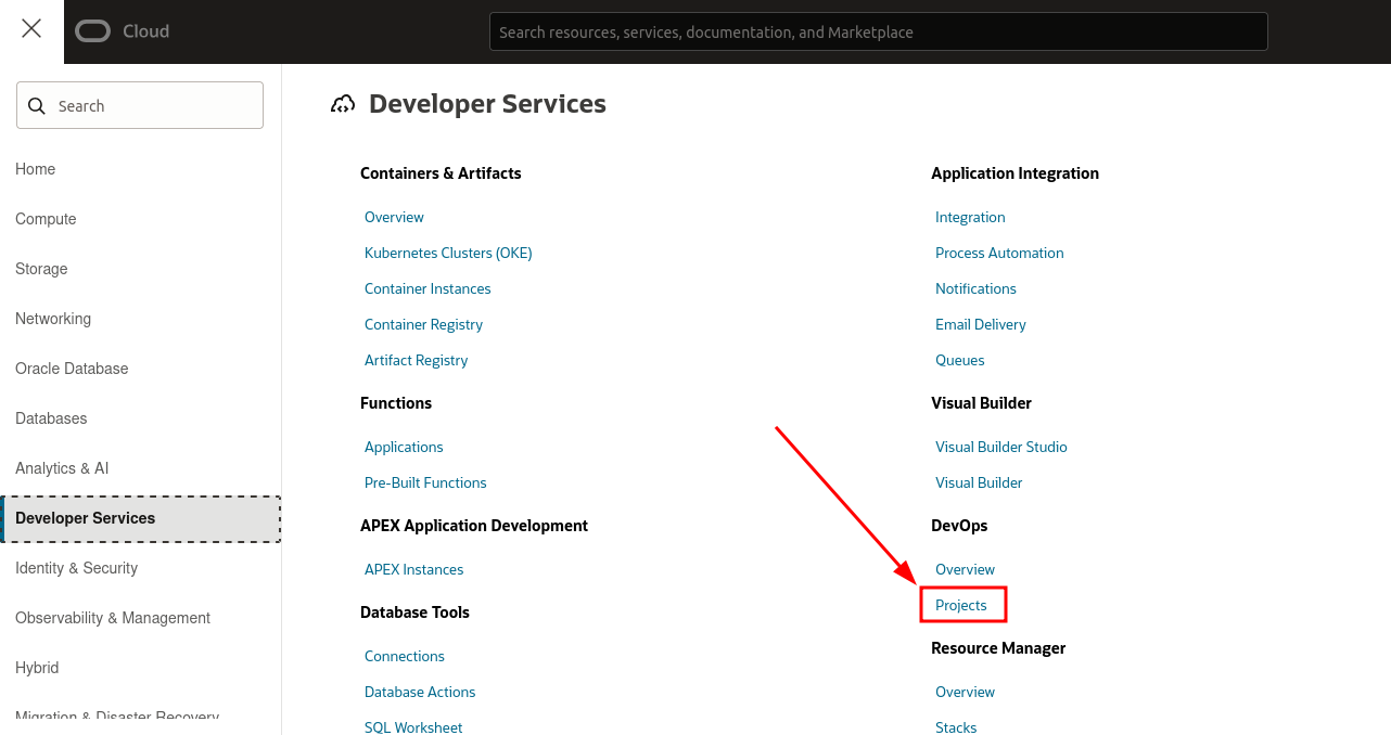 Next, create a new DevOps project by navigating to Developer Services > Projects in the OCI console menu bar and selecting Create DevOps Project.