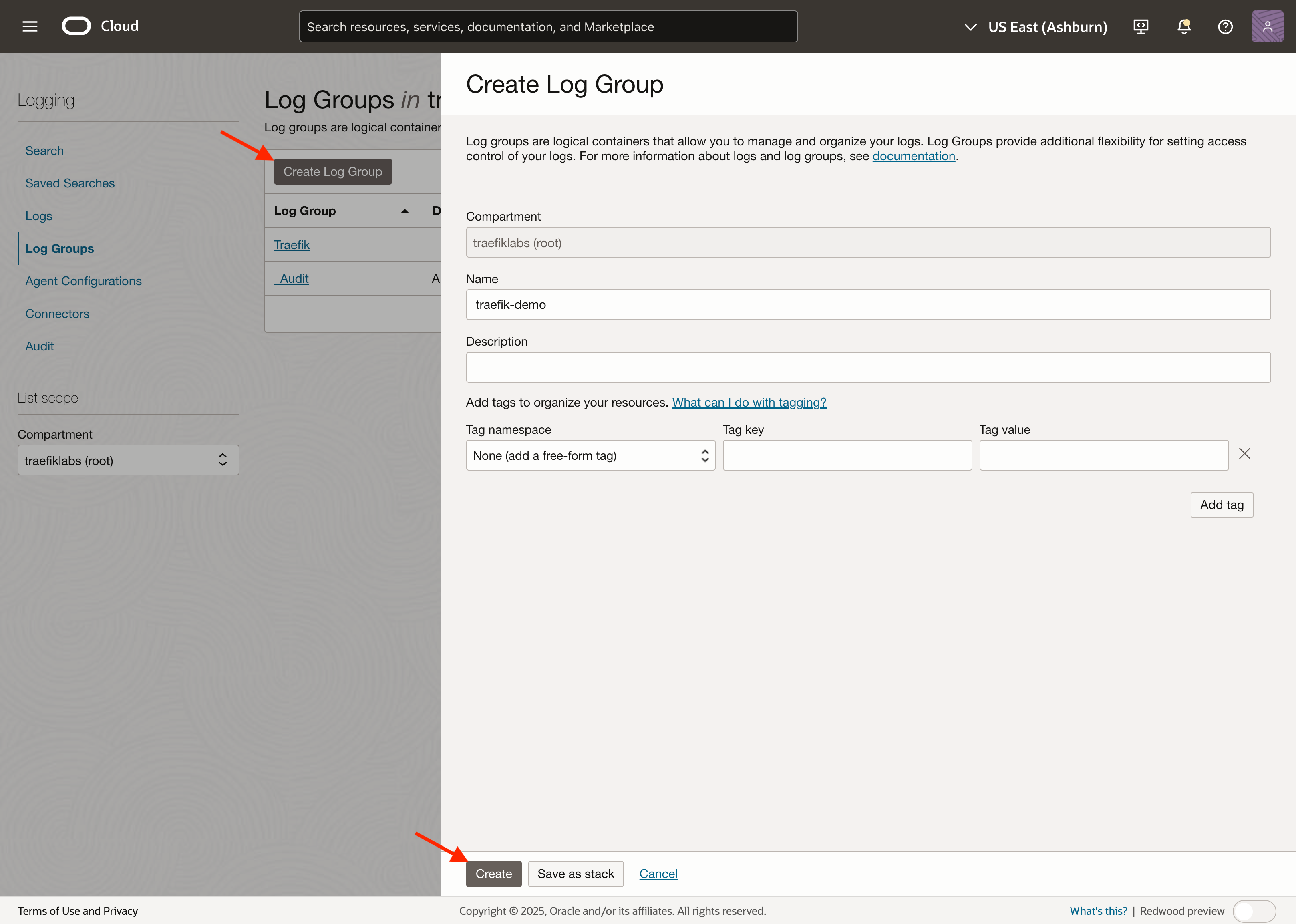 Next, select the Create Log Group button, complete the form, and then select Create.