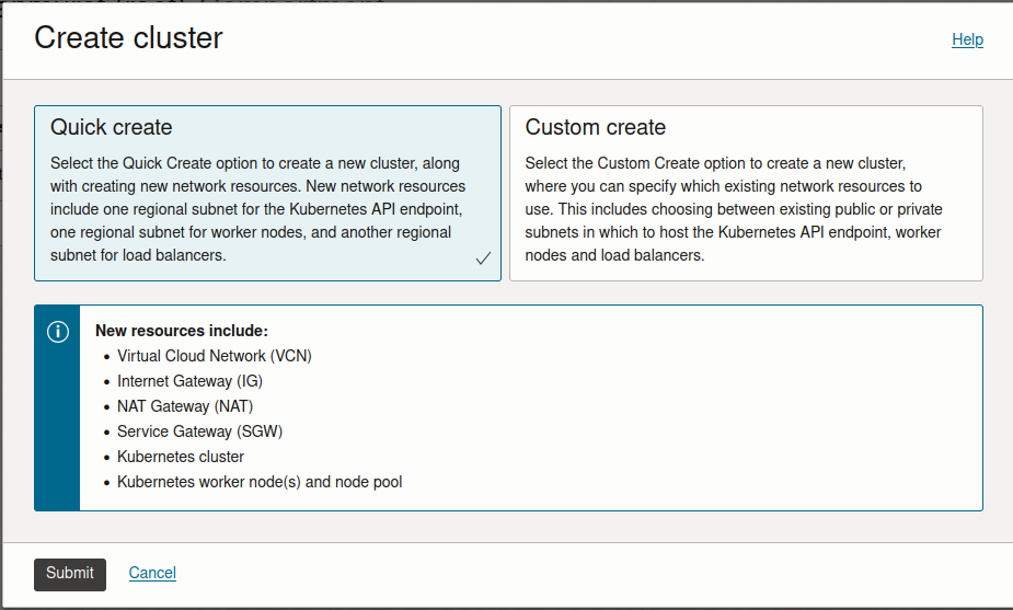 Next, select the Create Cluster button, choose Quick Create, and then select Submit.