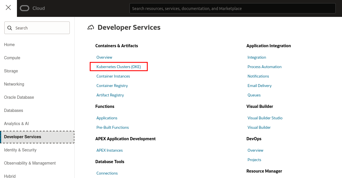 Start by creating your OCI Kubernetes Engine Cluster. Navigate to Developer Services > Kubernetes Clusters in the Oracle Cloud Infrastructure console menu bar.