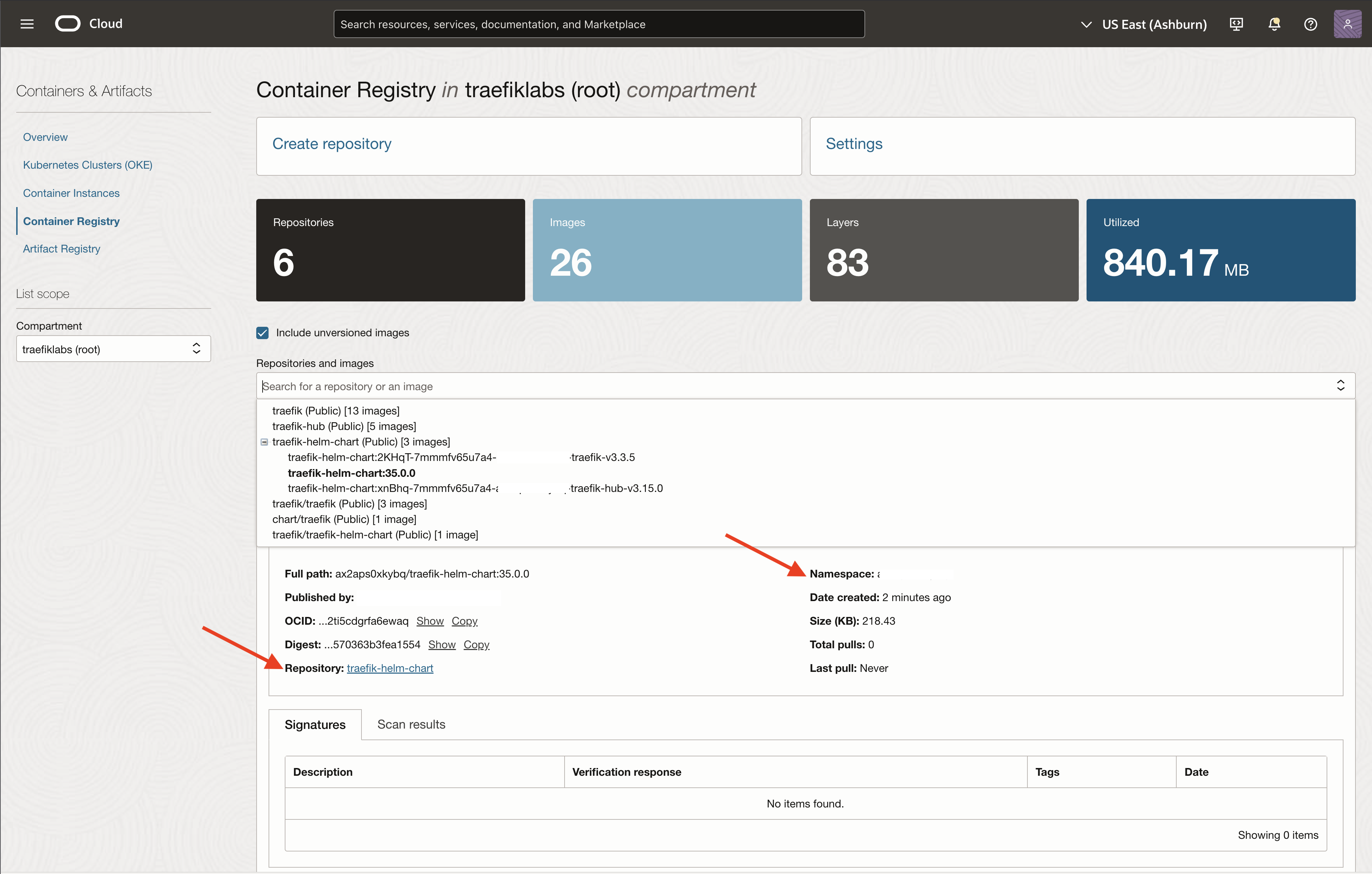 <repo-name>) and tenancy namespace (<tenancy-namespace>) in the OCI console by navigating to Developer Services > Container Registry > Repositories.