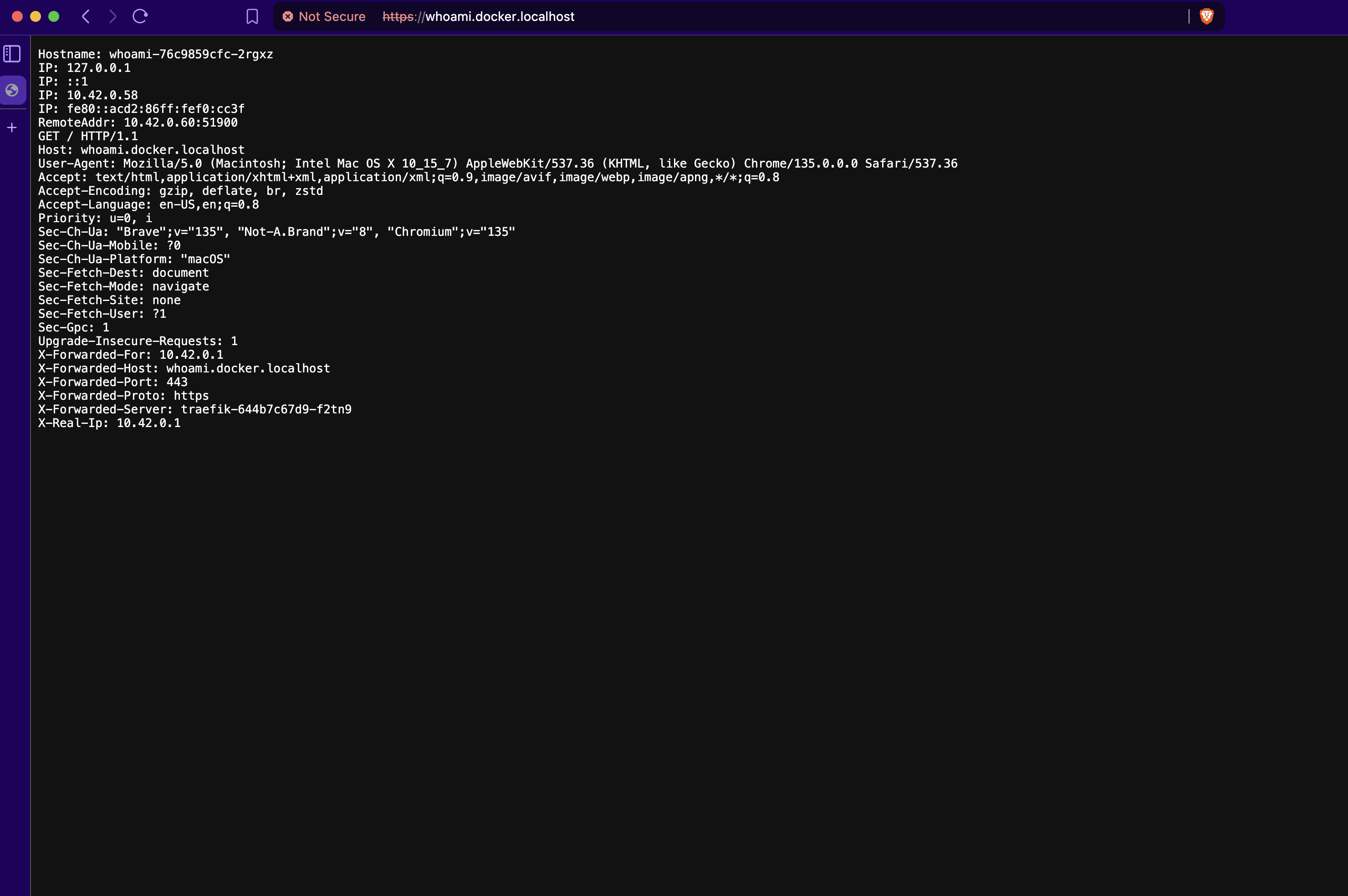 You can also open a browser and navigate to https://whoami.docker.localhost to see a JSON dump from the service: